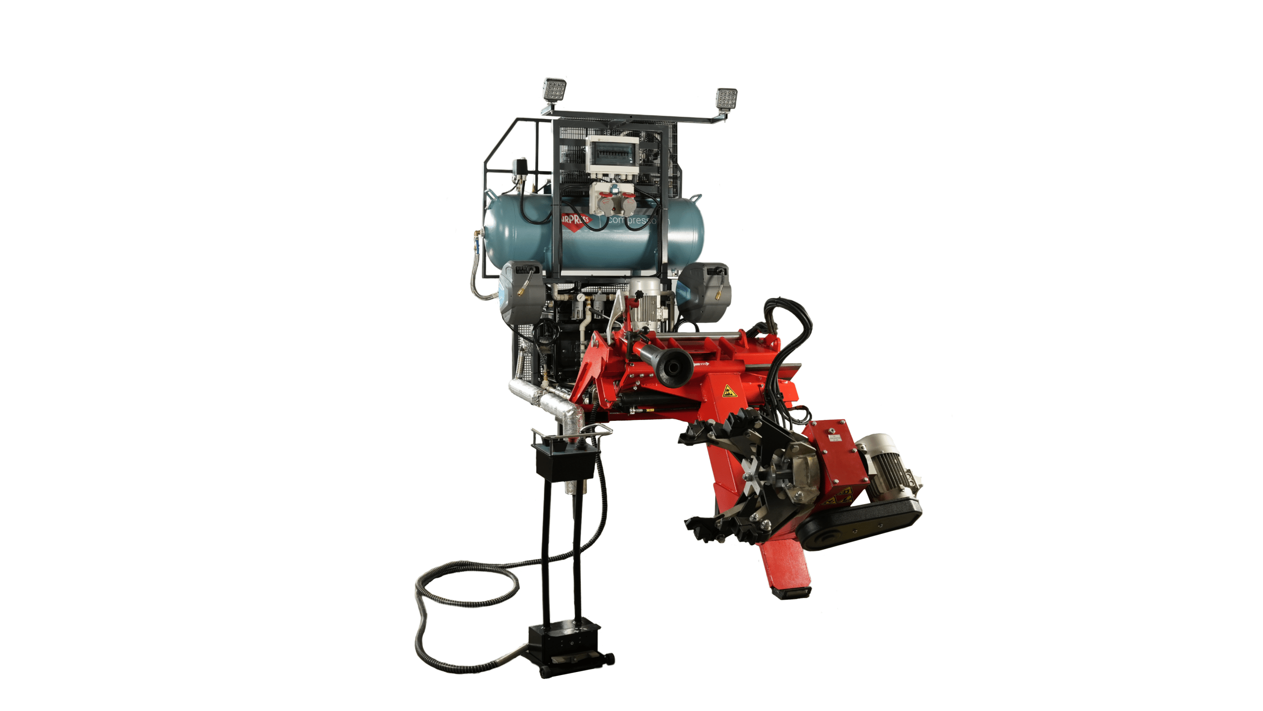Część robocza montażownicy rozkłada się na zewnątrz samochodu, zapewniając wygodne i efektywne korzystanie. Zestaw zawiera montażownicę mobilną, kompresor ze zbiornikiem, agregat prądotwórczy, oświetlenie halogenowe, zwijadła pneumatyczne (15 m), szybkozłącza pneumatyczne oraz gniazda prądowe 3-fazowe i 1-fazowe (400V, 230V).